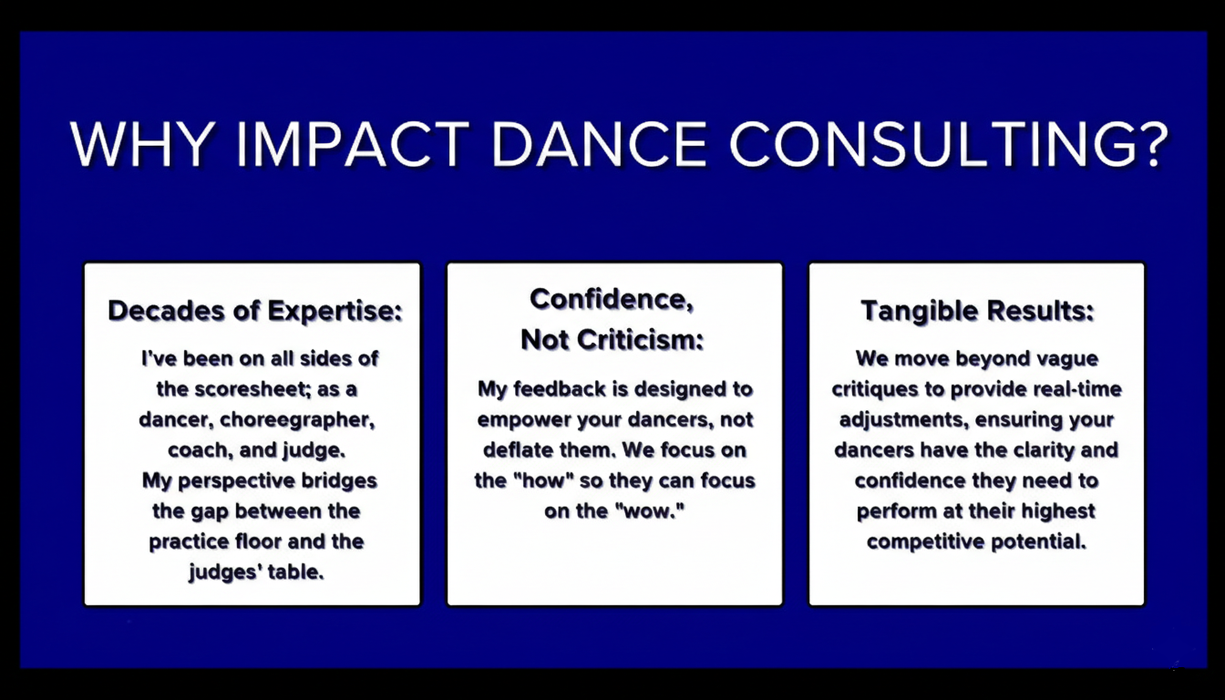 The Approach: I bring a judge’s perspective directly to your space, while offering clear, actionable adjustments alongside you in rehearsal.