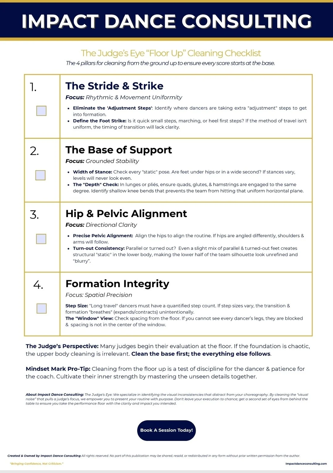 Image of the Impact Dance Consluting Judge’s Eye Floor-Up Cleaning Check List Published April 28, 2026