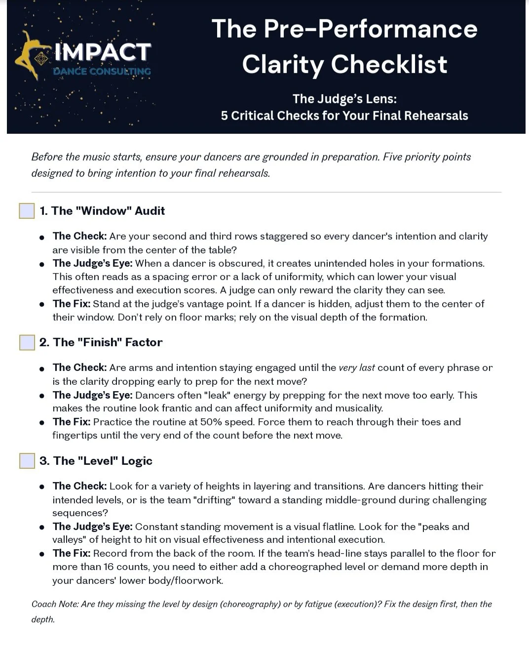 I have put together my "5 Points for the Inside Edge," a simple guide designed to help you find the small spots in your dance that need a little more care. From balancing your formations to making sure your dancers stay engaged until the final pose, this guide gives you practical ways to polish your work.